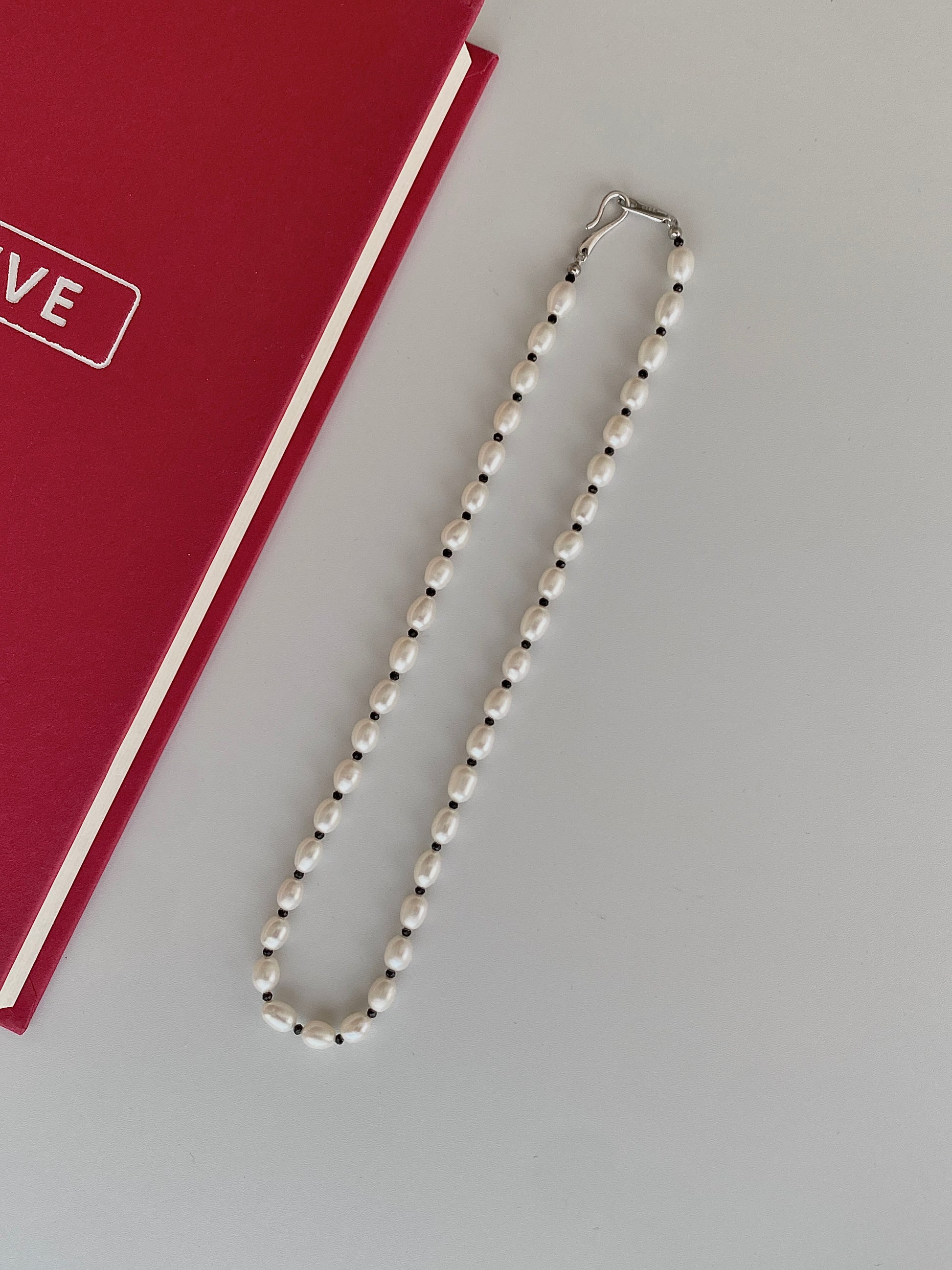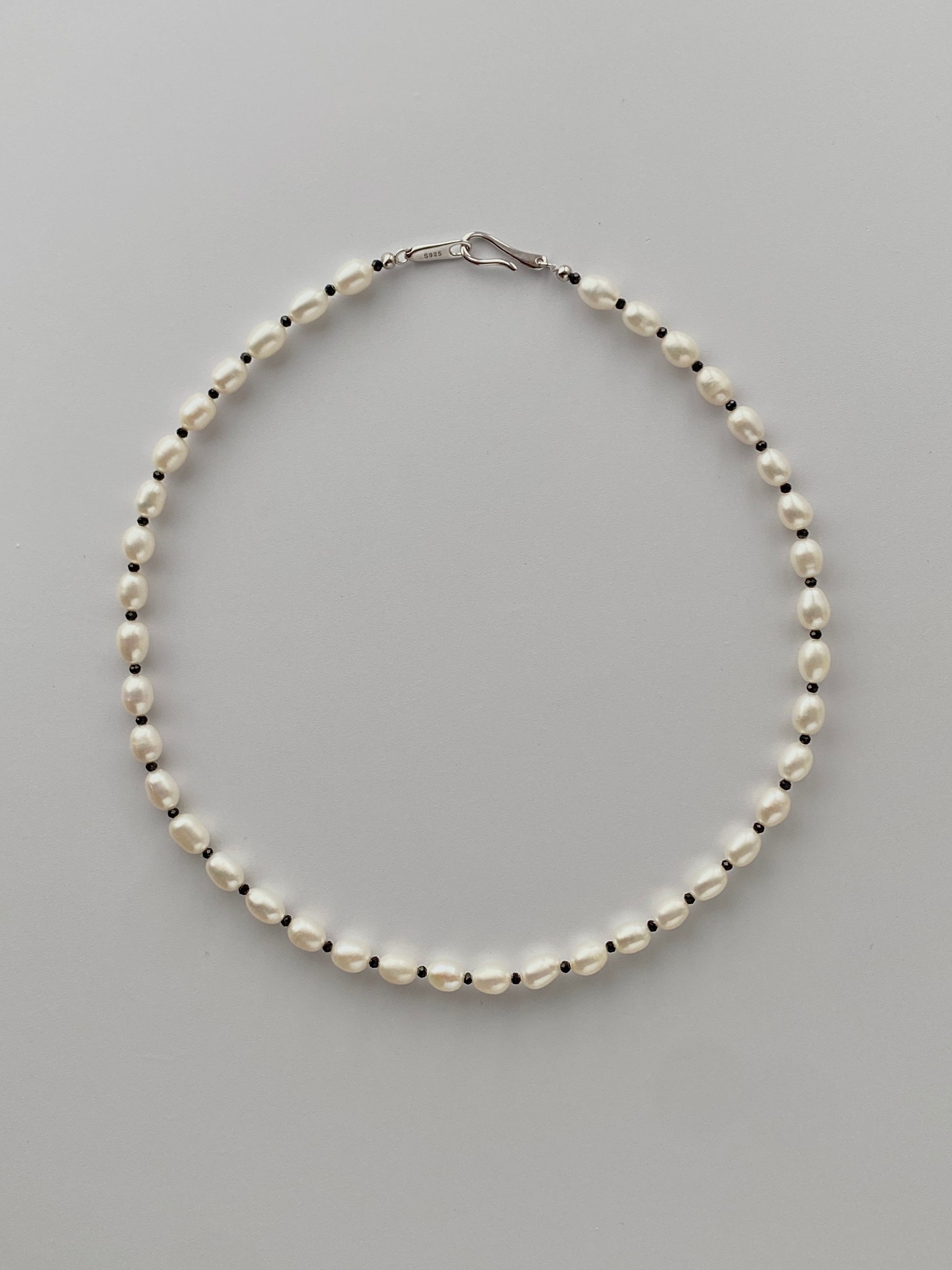 The Lucia Necklace features a strand of rare rice-shaped Freshwater pearls, meticulously hand-strung and punctuated by gleaming black spinel beads. Crafted for the discerning individual who appreciates subtle luxury and unique detail, this necklace is a testament to sophisticated artistry.