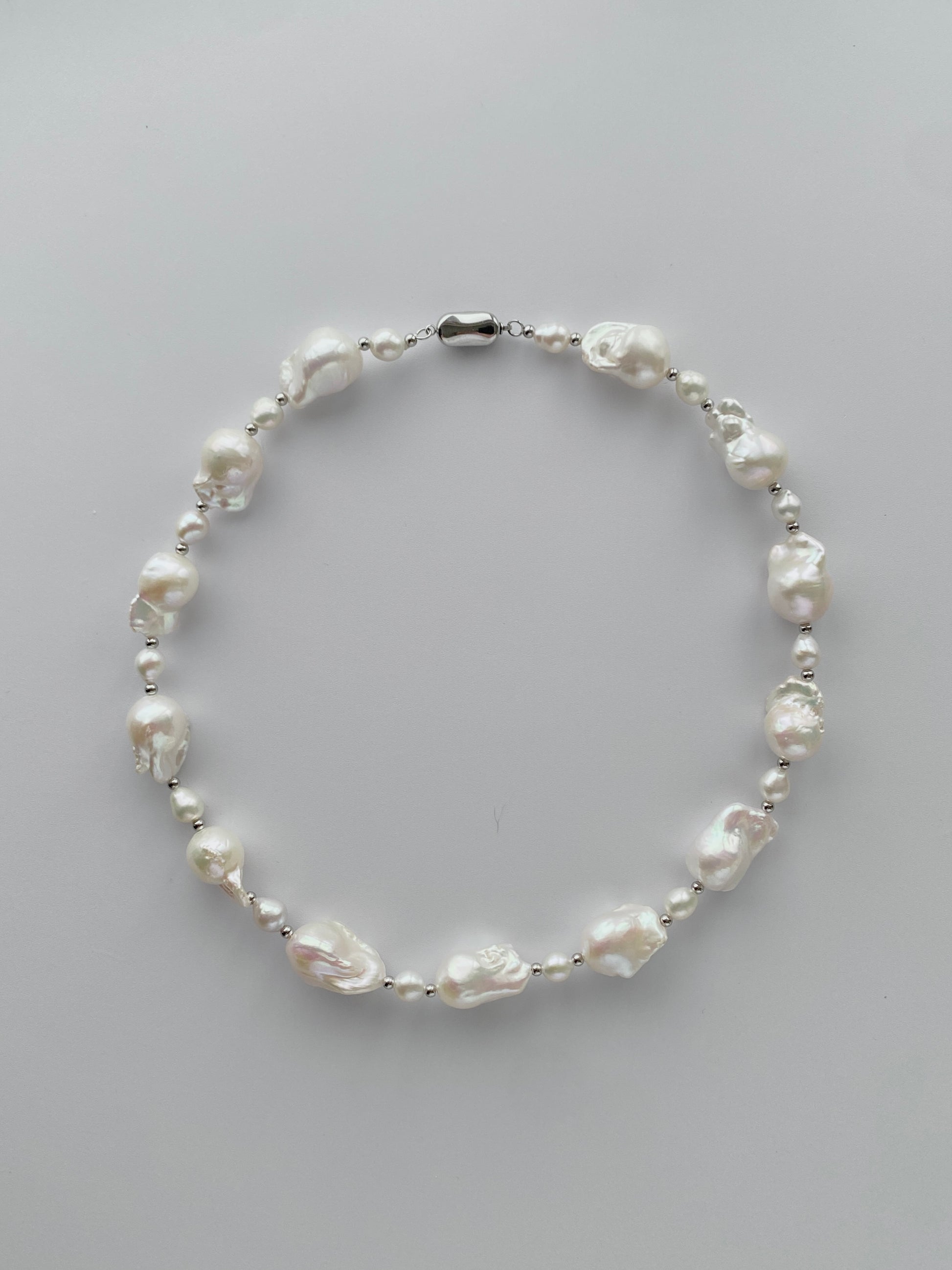 The Terra Necklace is a powerful statement piece that celebrates the untamed beauty of nature. This bold design masterfully combines the organic, sculptural forms of large baroque pearls with the sleek, modern gleam of stainless steel beads. More than just jewelry, it's a wearable art piece for the confident individual who isn't afraid to defy convention and express their unique style.